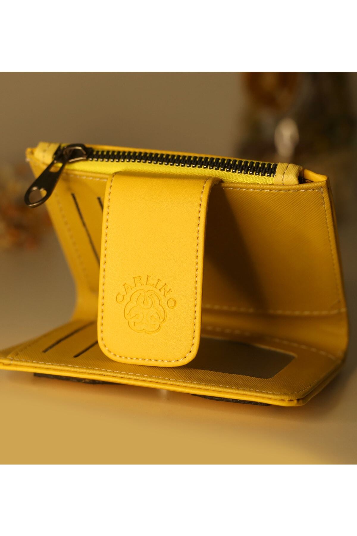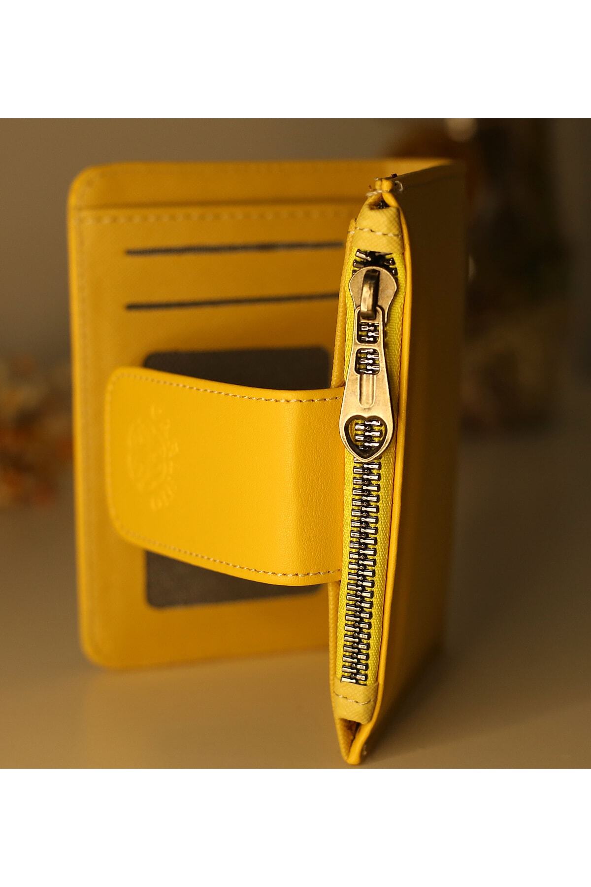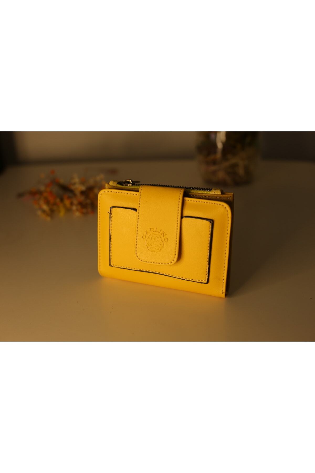 Yellow Colored Wallet *The wallet has a snap fastener. *Made from artificial leather. *There are 5 separate card slots inside the wallet. *The compartment for coins has a zipper. *Paper money is also available. *It is 13 x 10 cm.