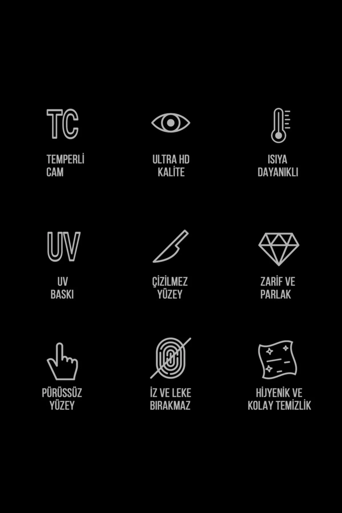 •Product Dimension: 50x70cm •Installation: A different innovative interior decoration solution is offered with this extremely simple and stylish product. •Printing: UV printing technique has been applied. •Thickness: 4 mm thick, first-class flat glass with tempered edges and grinded edges, which is 10 times more resistant to breakage than normal glass. •Information: With special metal hanging apparatus, there is no risk of our product accidentally falling from where it is hung. •They do not fade over time and can be easily cleaned with a damp cloth.