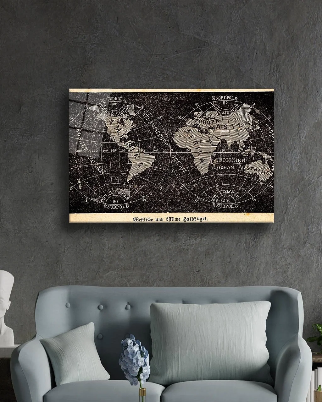 TEKNOO- Old Black and White Old World Map Glass Painting