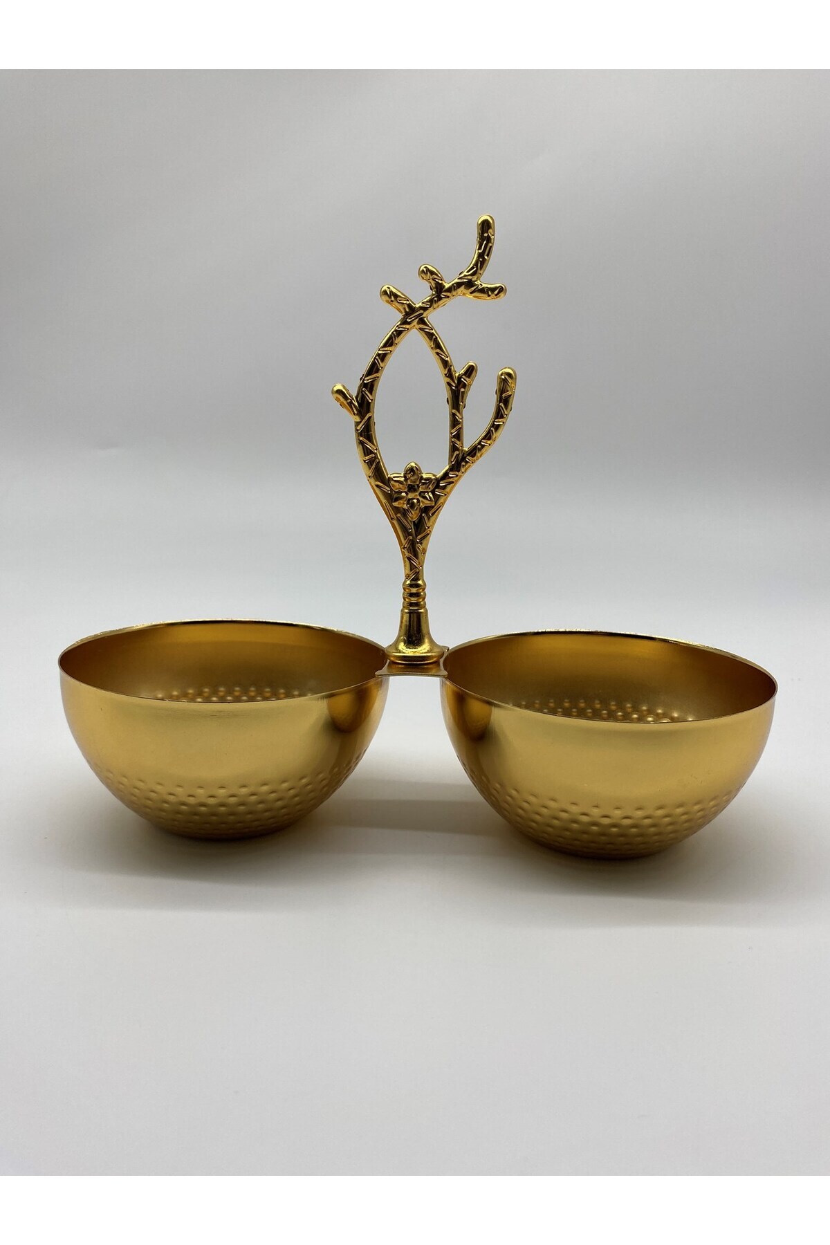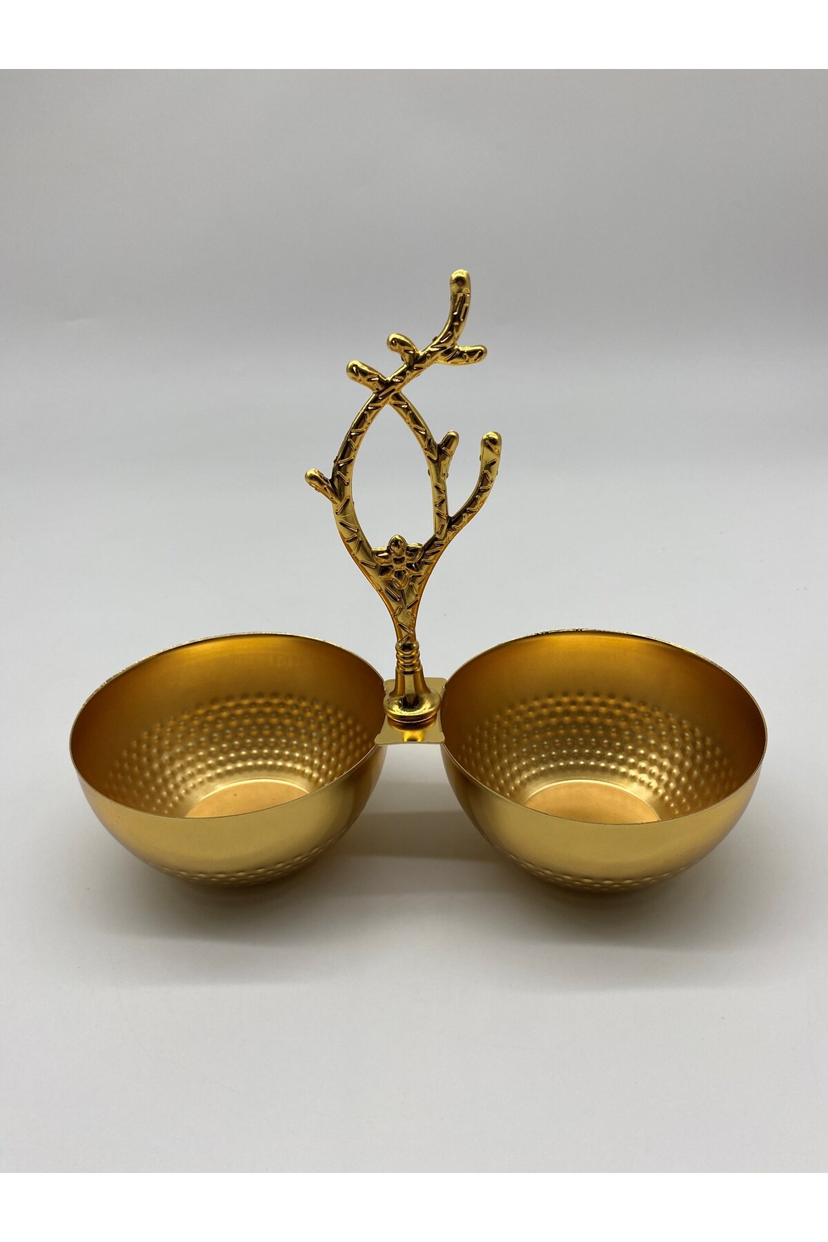 2 Compartment Gold Metal Snack Bowl, Snack Plate with Gold Branches