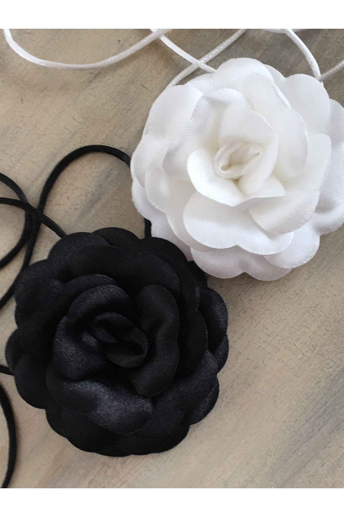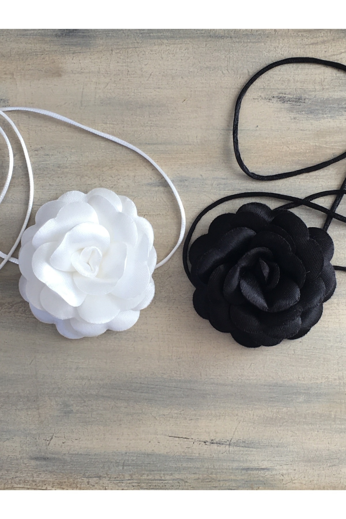 Satin rose necklace; The necklace is laced; It can be adjusted lengthwise as desired; It is an accessory that adds elegance to clothes; Its average size is 8 cm;