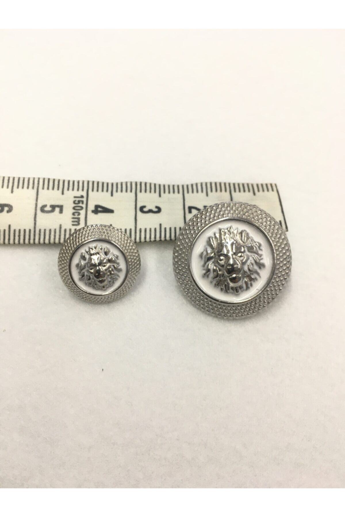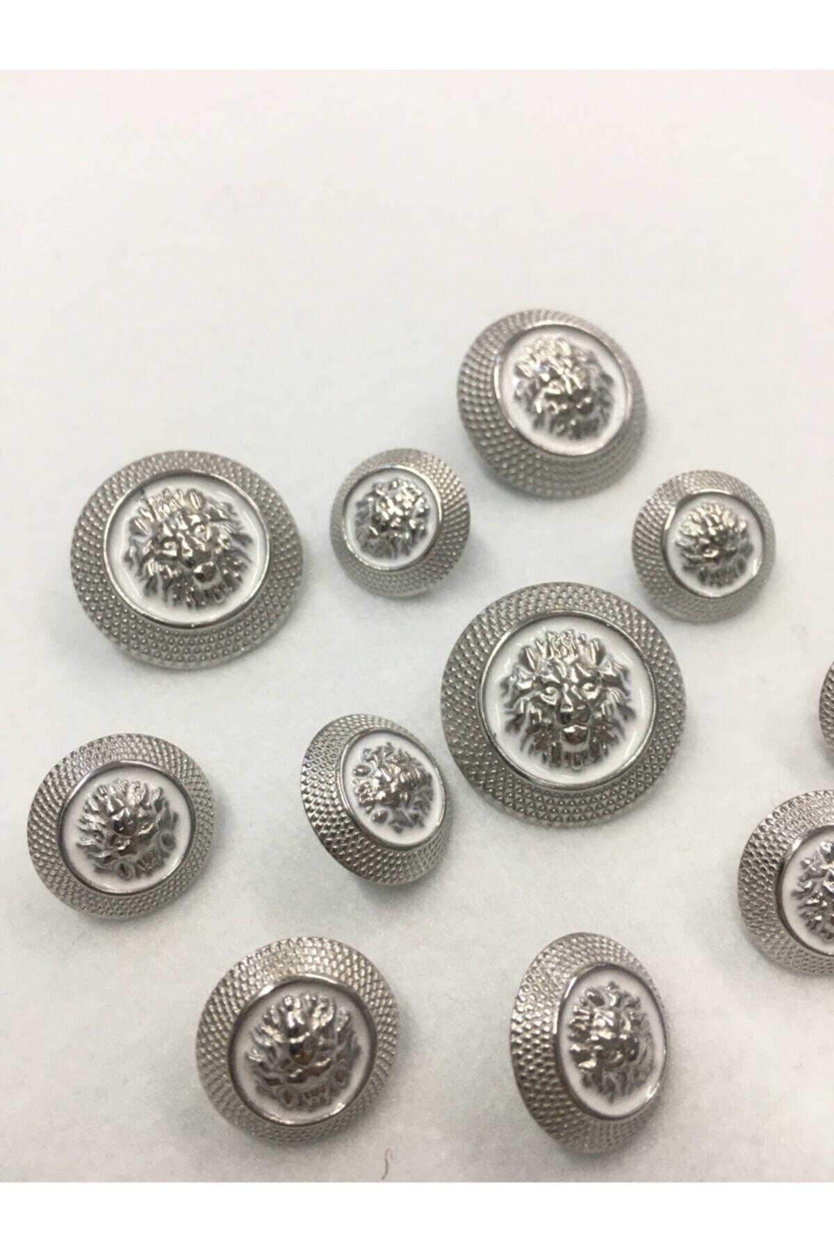 Blazer jacket button. Lion head model. The surrounding area is smoked silver and the interior paint is white. New style blazer button. Package content includes 3 large size buttons and 8 small size buttons. Button dimensions: The big button is 2 cm in diameter. The small button is 1.5 cm in diameter.