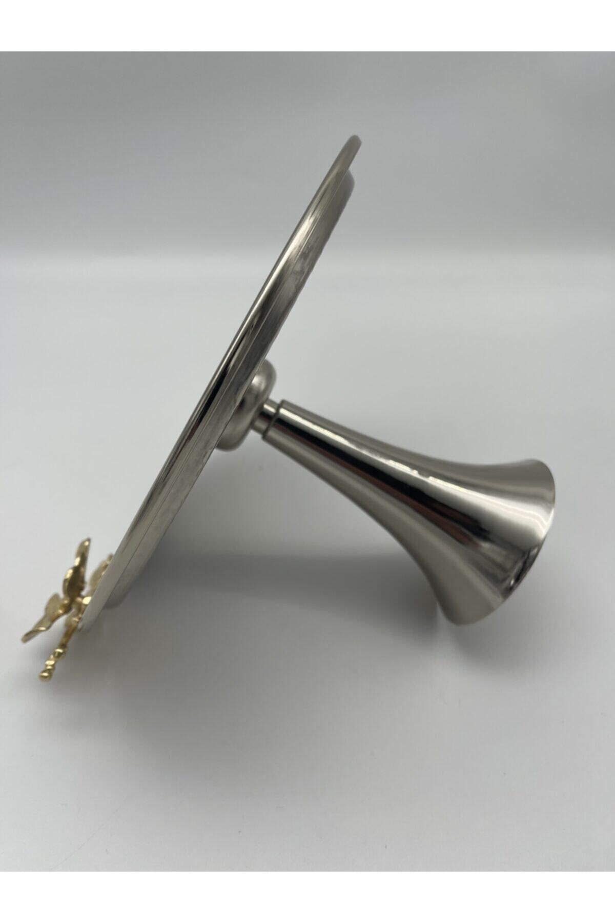 Product Dimensions: Width/Length is 22 cm, height is 15 cm. Combining elegance and elegance, the silver round metal tea and coffee serving tray with legs is designed to add privilege to your special moments. This stylish tray, which will complement your table setting at tea times, coffee breaks or special invitations, will make your unforgettable moments even more special. The round form of the tray offers an ideal space to display your cakes, cupcakes, cookies and other delicious treats.