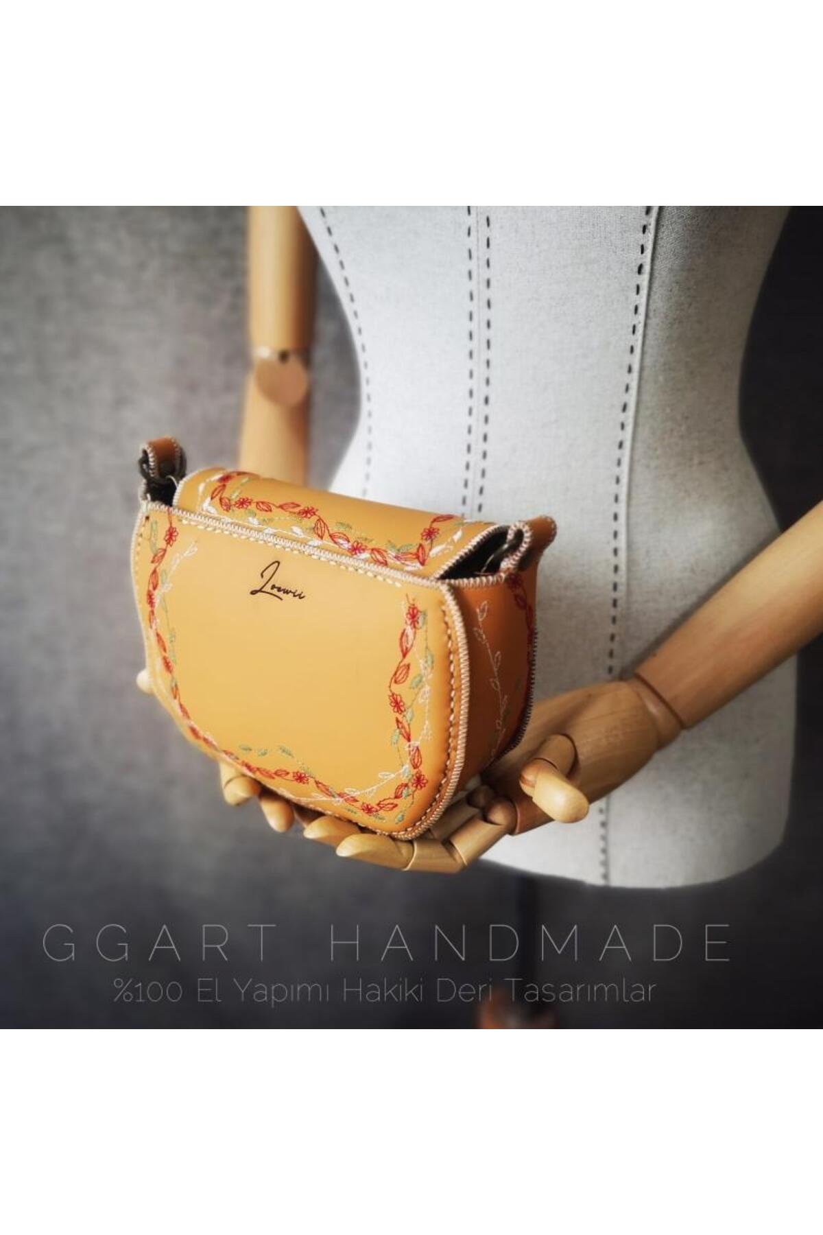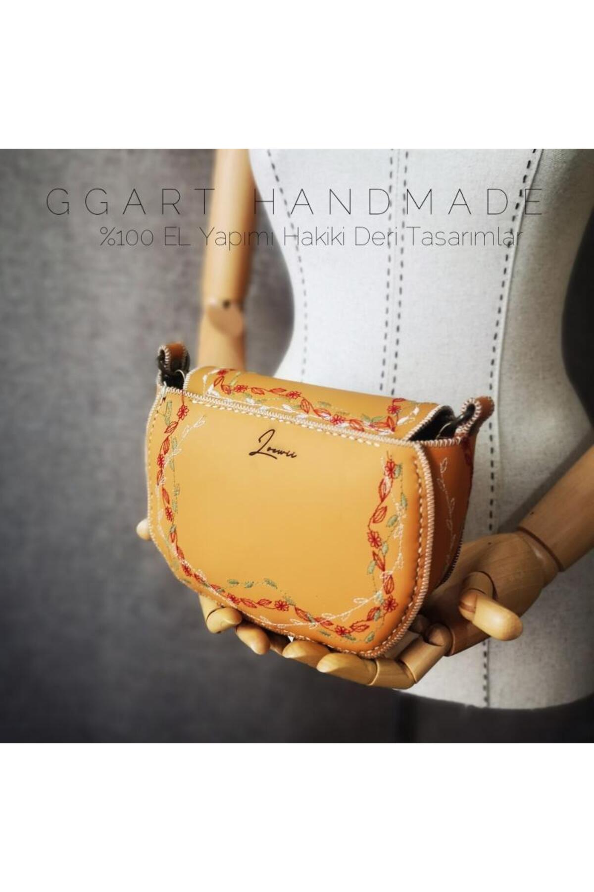 GENUINE LEATHER HAND MADE BAG - LOEWII FEATURES - Our products are produced using top quality Genuine Leather (Crazy, Vegetal) and with 100% Hand Labor in a warm house converted into a workshop. - The edges of the designs are sewn by hand with a 1950 model PFAF brand sewing machine and overcasting is done to prevent edge fraying. - Each of our bags has embroidery on leather using a high-end embroidery machine from PFAF brand. All of our embroideries are embroidered with ANCHOR brand embroidery threads. - The inside of our bags, the reverse side of the leather, is covered and closed with Scottish Linen in accordance with the design. - Brass Behçi is used on the product cover. - The products are packaged in a cardboard box specific to their size, wrapped in white tissue paper and closed with a wicker rope, and the box is filled with scraps. The cargo is delivered to you with a presentation in the style of a gift package. - DIMENSIONS 20cmX15cmX8cm The product has the volume and width to accommodate a mobile phone, wallet, business card holder and various make-up accessories.
