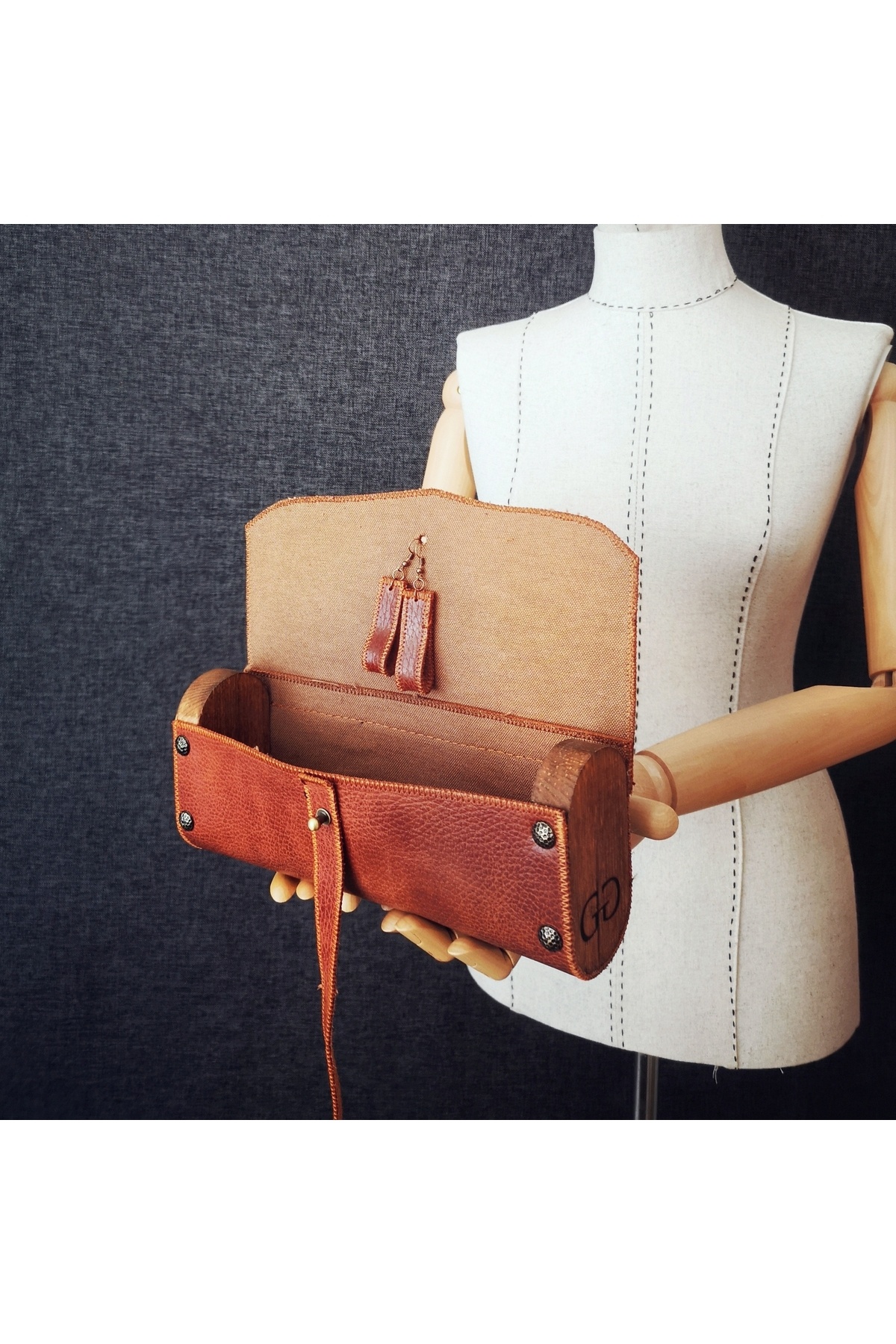 GENUINE LEATHER HAND MADE BAG - LARISSA FEATURES - Our products are produced using top quality Genuine Leather (Crazy, Vegetal) and with 100% Hand Labor in a warm house converted into a workshop. - The edges of the designs are sewn by hand with a 1950 model PFAF brand sewing machine and overcasting is done to prevent edge fraying. - Each of our bags has embroidery on leather using a high-end embroidery machine from PFAF brand. All of our embroideries are embroidered with ANCHOR brand embroidery threads. - The inside of our bags, the reverse side of the leather, is covered and closed with Scottish Linen in accordance with the design. - Wooden Edges are manufactured from BB – BC Quality Solid Panel or Ireko Wood Solid Panel. - Brass Behçi is used on the product cover. It is nailed from the front and back with patterned ribs and glued to the wooden material beforehand. - The products are packaged in a cardboard box specific to their size, wrapped in white tissue paper and closed with a wicker rope, and the box is filled with scraps. The cargo is delivered to you with a presentation in the style of a gift package. - DIMENSIONS 23cmX10cmX5.5cm The product has the volume and width to accommodate a mobile phone, wallet, business card holder and various make-up accessories.
