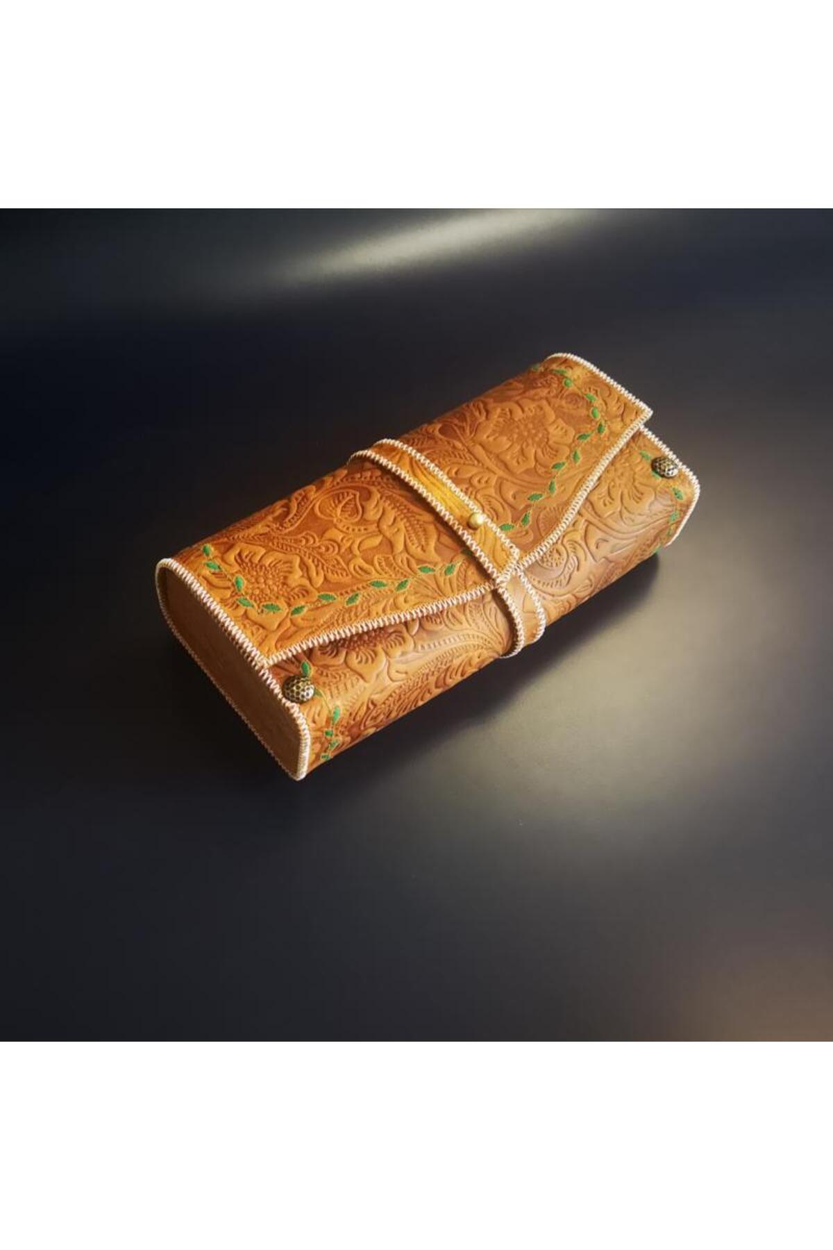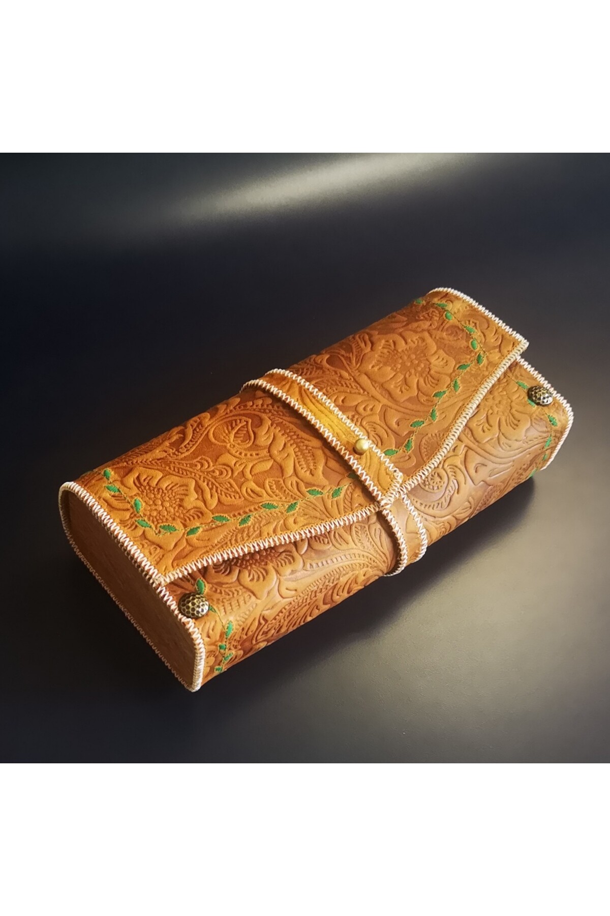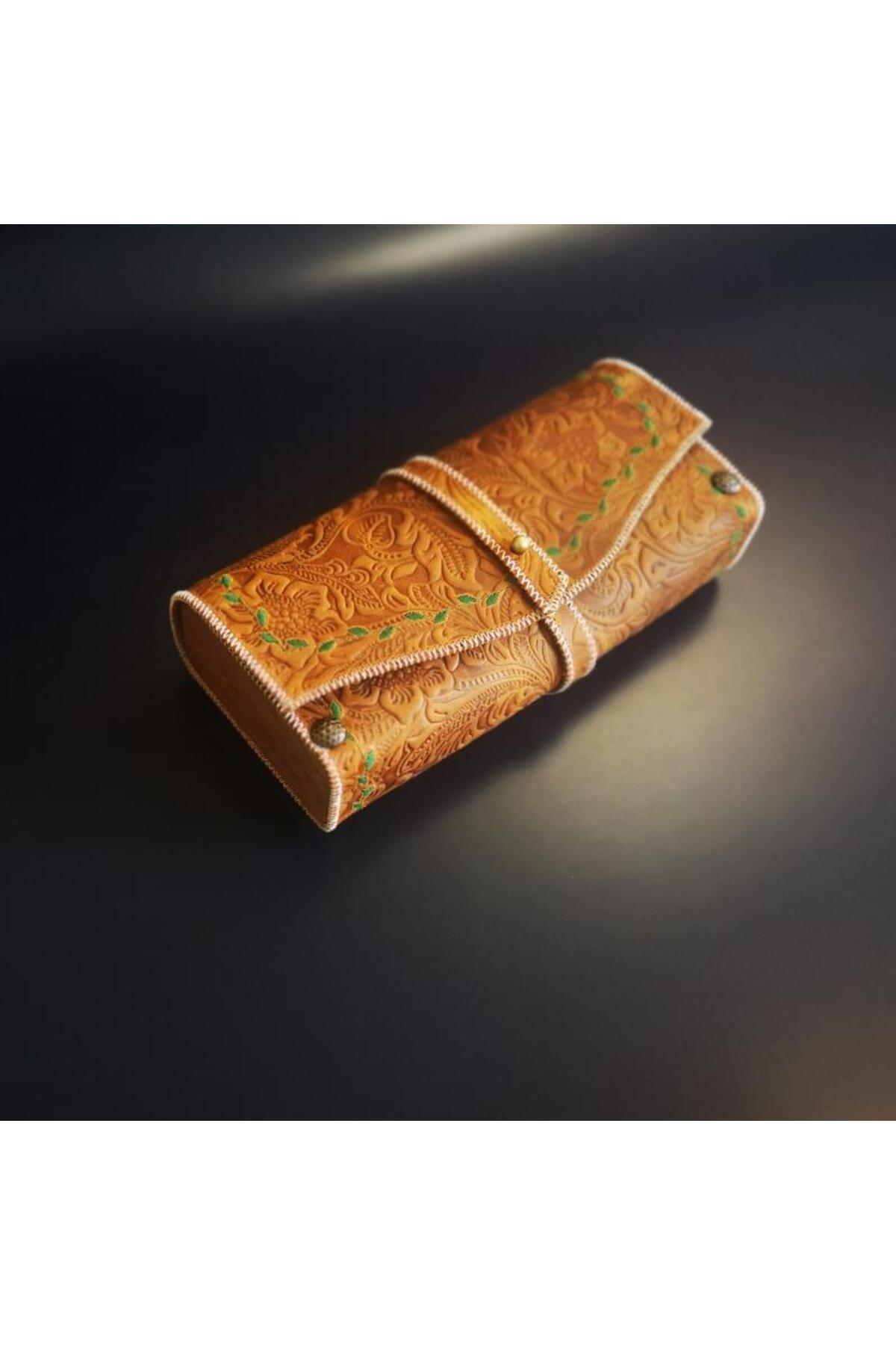 GENUINE LEATHER HAND MADE BAG - LARISSA FEATURES - Our products are produced using top quality Genuine Leather (Crazy, Vegetal) and with 100% Hand Labor in a warm house converted into a workshop. - The edges of the designs are sewn by hand with a 1950 model PFAF brand sewing machine and overcasting is done to prevent edge fraying. - Each of our bags has embroidery on leather using a high-end embroidery machine from PFAF brand. All of our embroideries are embroidered with ANCHOR brand embroidery threads. - The inside of our bags, the reverse side of the leather, is covered and closed with Scottish Linen in accordance with the design. - Wooden Edges are manufactured from BB – BC Quality Solid Panel or Ireko Wood Solid Panel. - Brass Behçi is used on the product cover. It is nailed from the front and back with patterned ribs and glued to the wooden material beforehand. - The products are packaged in a cardboard box specific to their size, wrapped in white tissue paper and closed with a wicker rope, and the box is filled with scraps. The cargo is delivered to you with a presentation in the style of a gift package. - DIMENSIONS 23cmX10cmX5.5cm The product has the volume and width to accommodate a mobile phone, wallet, business card holder and various make-up accessories.