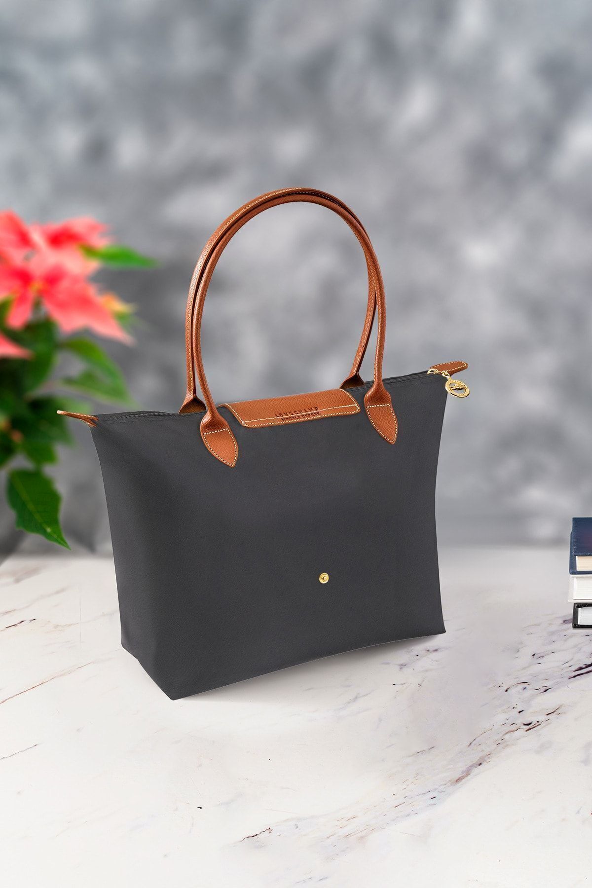 Gray Color Snap Fastener Real Leather Handle Foldable Women's Shoulder Bag Longchamp Style