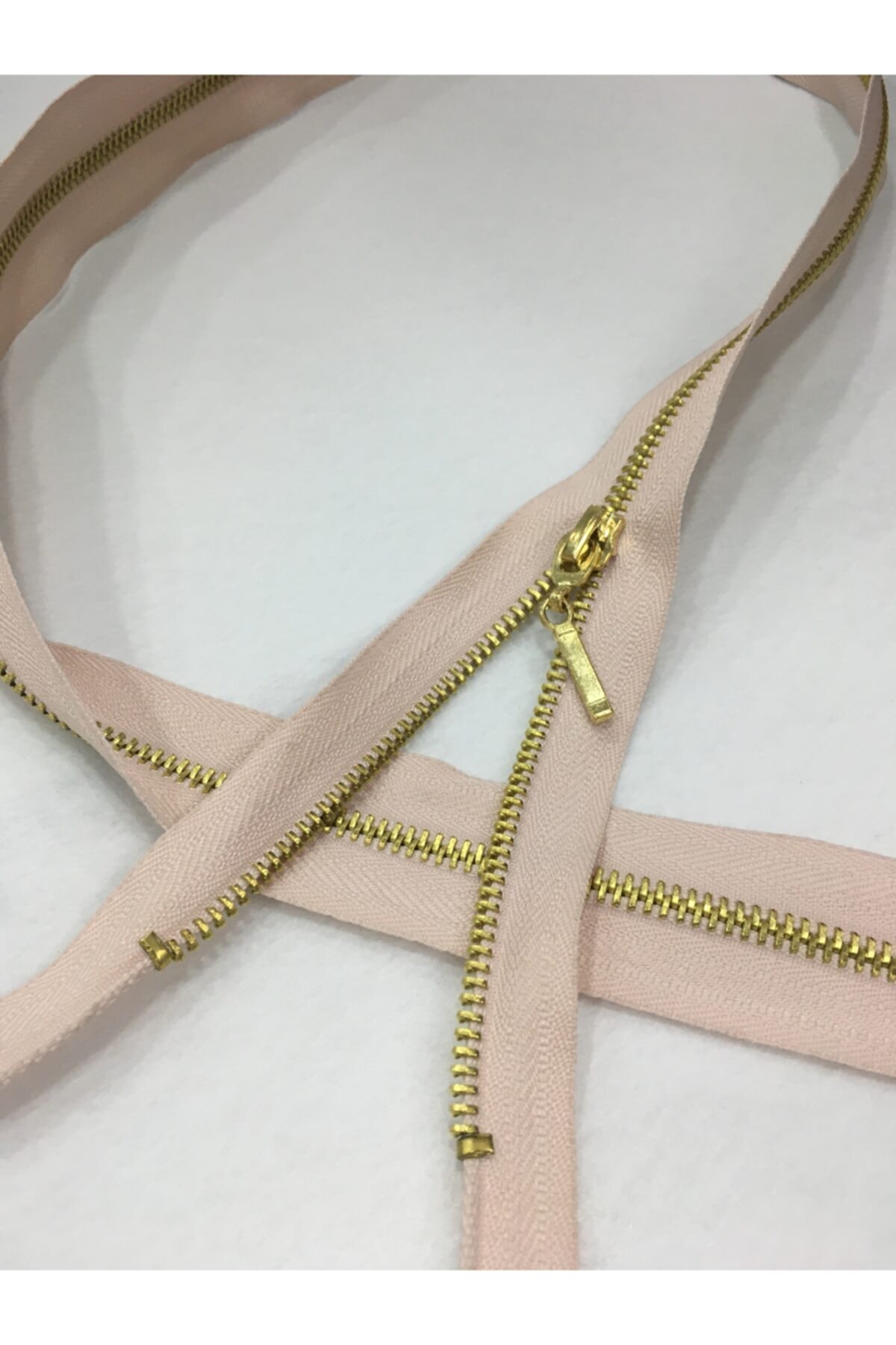 90 cm long powder color zipper with metal teeth. Zipper that can be separated into two from the bottom - fabric color powder color tooth color gold. You can shorten the zippers at the top according to the length you want and assemble them.