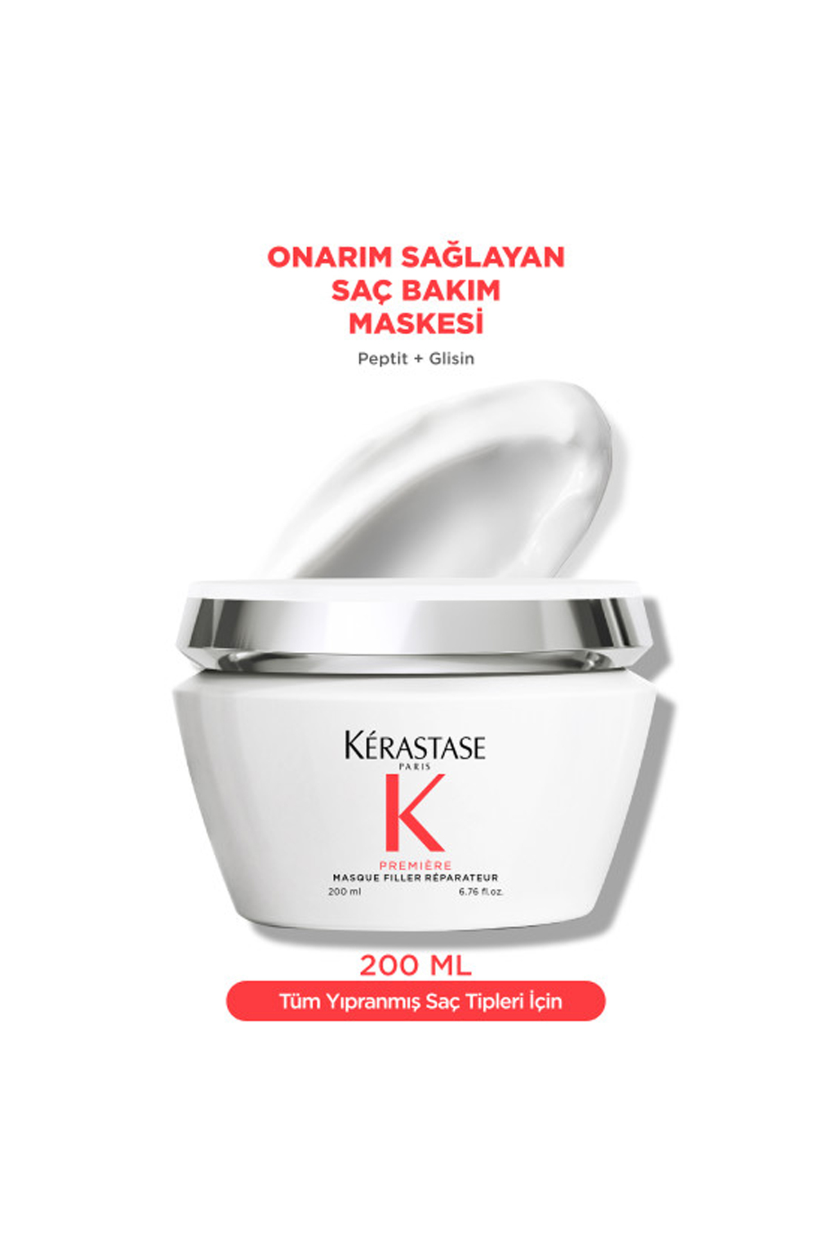 Masque Filler Reparateur anti-breakage and protective hair mask from the Premiere series, specially developed by Kerastase for damaged hair care, is suitable for all damaged hair types. ; It repairs over-processed hair from the inside out and protects against breakage. ; It makes hair stronger and smoother with regular use. ; Although calcium is naturally present in the structure of the hair, damaged hair absorbs this mineral 3 times more than it should whenever it comes into contact with water;