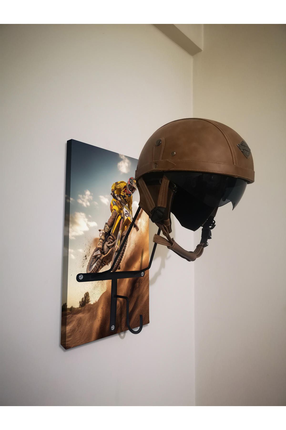 SPECIAL HELMET RACK, MOUNT, EQUIPMENT RACK FOR MOTORCYCLISTS Product Features SPECIAL DESIGN THAT DOES NOT CONTACT THE PAD - Metal part angles and lengths are specially designed and do not come into contact with the protective pad inside the helmet. When you place your helmet correctly, it rests on the visor upper gap and the upper part of the neck, allowing your helmet to lie flat as if it were on your head, without touching the pad. - The metal design of the helmet hangers is independent of the size of your helmet and is suitable for any size. - It is manufactured using 6mm Transmission iron. It does not bend or bend and is extremely durable. - Baked Electrostatic Black Matte Texture Painted. In this way, the metal parts do not scratch or rust and maintain their form for years. - Panels used in wooden models are manufactured from BB - BC quality natural wood solid panels (models with smooth edges are X2-MP, Pine or Spruce) or from single-piece natural wood panels specially cut from imported Russian pine (models with natural appearance are X2-Natura). . - Printed and illustrated models are Glossy 1st Class Canvas prints. The canvas print is placed on a wooden panel and stapled at the back. HELMET RANGER, COAT RANGER and KEYRING HANGER - 2 cobra hooks are delivered with the product to hang your keys. You can mount these hooks at any point you want on the panel. - There is a hook on each metal part to hang your coat on the helmet hanger rails with a clothes hanger. Metal parts are delivered disassembled to prevent damage to the panel during shipping. You can mount it practically with 3 screws. Screws and washers are packaged within the product. EASY INSTALLATION Easy installation with two hangers on the back. It is enough to place a dowel and two screws on the wall. You hang the product like a painting. Since the wall type is unknown, the screws and dowels to mount it on the wall are not included in the package. Product Dimensions SINGLE HANGERS - 30X50cm brand panel size. DOUBLE HANGERS - 30x70cm brand wooden panel size. ECO MODEL - 10x50cm brand wooden panel size. PERSONALIZATION - If personalization is desired on the panel, NAME-SURNAME, LOGO or NAME can be engraved with CNC Laser, free of charge, in the lower left corner. - If orders come through sales channels, Genuine Leather is personalized and added to the package. You can easily stick it to any corner of the panel you want. -Do not forget to send your photos in the appropriate resolution and format for our hangers prepared as canvas prints. IN CASE OF SHIPPING AND DAMAGE - Damage to the product in cargo is a very rare situation that we encounter, but we kindly ask you to contact us. We always replace the damaged part with a new one. - It is very important for you to take time for your damaged cargo and keep a cargo damage report so that our efforts do not go to waste. Even if there is no report, we will definitely be resolving your grievance. NOTE: Helmets and coats are not for sale. The product on sale is HELMET RACK. GGARTDECORATION GGARTHANDMADE ls2, axxis,nexx, jk20, ncr, sway, helmets, bell, freem, jarvis, mt, gopro, gdr, caberg,agv, aerowind, cox, ncr, jk, tex, shark, shoei, airoh, givi, hjc, suomy, arai,premier, revit, tucano, vexo, rsv, harley, venom, motul, oem, jiekai, monero,bering, kappa, salomon, nero, momo, macna, knmaster, schuberth, shiro, iron, akrapovic, rectus, gojo, mitas, daniese, divortex, vizor, putoline, ktm, yuma, buffer, ariete, shad, schulzz, bitwell, universal, maxxis, leyaton, tiens, bajaj, gogo, andes