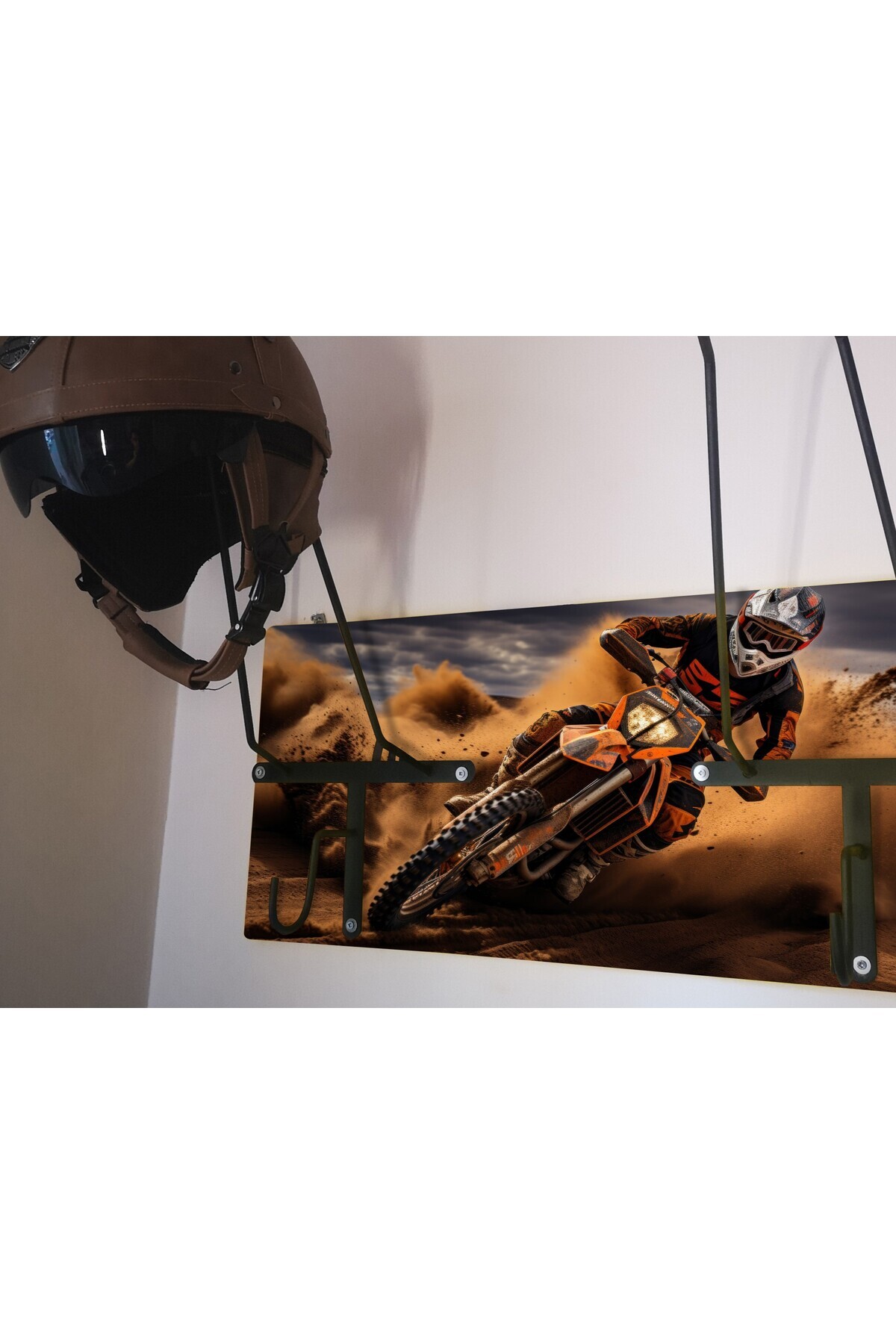 BIKER EQUIPMENT - HELMET RACK SPECIAL HELMET - EQUIPMENT RACK FOR MOTORCYCLER FEATURES; - SPECIAL DESIGN THAT DOES NOT CONTACT THE PAD. The angles and lengths of the metal parts are special and do not come into contact with the protective pad inside the helmet. It rests on the visor upper gap and the upper part of the neck, allowing the helmet to lie flat as if it were resting on the head. It is independent of the body. - 6mm TRANSMISSION IRON Does not bend or twist. Oven Baked Static Black Matte Texture Painted Metal Parts do not scratch or rust. - FABRIC OR CANVAS PRINTING DRESSING ON WOODEN PANEL (MDF, MDF LAM) Dressing is done by stretching a special bright 1st Class Canvas print image on 18mm-20mm Wooden Panel. - HELMET RANGER, COAT RANGER and KEYRING HANGER. Cobra hooks for hanging 2 key rings are supplied with the product. You can mount these hooks at any point you want on the panel. There is a hook on the helmet hanger bars to hang your coat on a hanger. Metal parts are delivered disassembled to prevent damage to the panel during shipping. You can mount it practically with 3 screws. Screws and washers are packaged within the product. - EASY SETUP. Easy installation with two hangers on the back. All you have to do is place a dowel and two screws on the wall. You hang the product like a painting. Since the wall type is unknown, the screws and dowels to mount it on the wall are not included in the package. - DIMENSIONS 2 Panel Dimensions 30cmX70cm Single Panel Dimensions 30cmX50cm