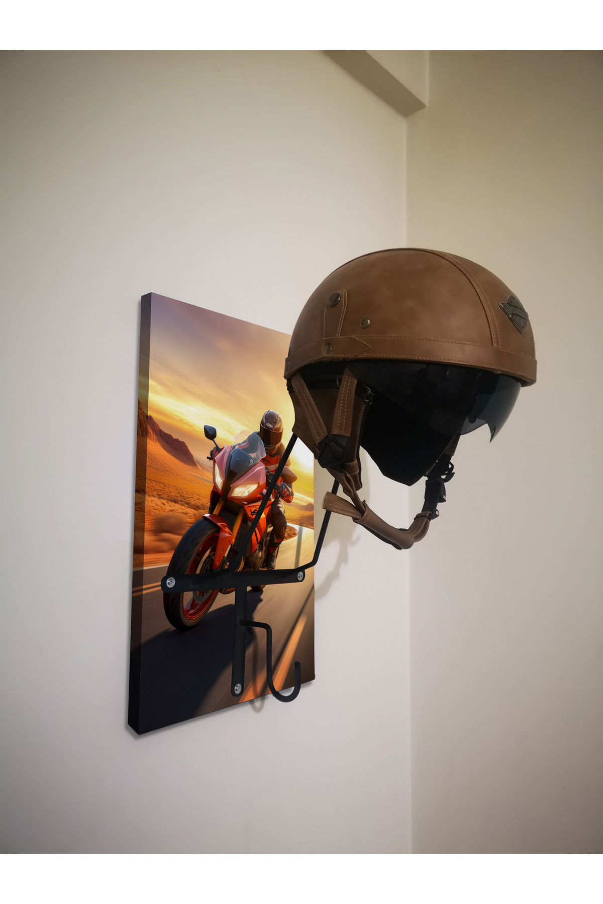 SPECIAL HELMET RACK, MOUNT, EQUIPMENT RACK FOR MOTORCYCLISTS Product Features SPECIAL DESIGN THAT DOES NOT CONTACT THE PAD - Metal part angles and lengths are specially designed and do not come into contact with the protective pad inside the helmet. When you place your helmet correctly, it rests on the visor upper gap and the upper part of the neck, allowing your helmet to lie flat as if it were on your head, without touching the pad. - The metal design of the helmet hangers is independent of the size of your helmet and is suitable for any size. - It is manufactured using 6mm Transmission iron. It does not bend or bend and is extremely durable. - Baked Electrostatic Black Matte Texture Painted. In this way, the metal parts do not scratch or rust and maintain their form for years. - Panels used in wooden models are manufactured from BB - BC quality natural wood solid panels (models with smooth edges are X2-MP, Pine or Spruce) or from single-piece natural wood panels specially cut from imported Russian pine (models with natural appearance are X2-Natura). . - Printed and illustrated models are Glossy 1st Class Canvas prints. The canvas print is placed on a wooden panel and stapled at the back. HELMET RANGER, COAT RANGER and KEYRING HANGER - 2 cobra hooks are delivered with the product to hang your keys. You can mount these hooks at any point you want on the panel. - There is a hook on each metal part to hang your coat on the helmet hanger rails with a clothes hanger. Metal parts are delivered disassembled to prevent damage to the panel during shipping. You can mount it practically with 3 screws. Screws and washers are packaged within the product. EASY INSTALLATION Easy installation with two hangers on the back. It is enough to place a dowel and two screws on the wall. You hang the product like a painting. Since the wall type is unknown, the screws and dowels to mount it on the wall are not included in the package. Product Dimensions SINGLE HANGERS - 30X50cm brand panel size. DOUBLE HANGERS - 30x70cm brand wooden panel size. ECO MODEL - 10x50cm brand wooden panel size. PERSONALIZATION - If personalization is desired on the panel, NAME-SURNAME, LOGO or NAME can be engraved with CNC Laser, free of charge, in the lower left corner. - If orders come through sales channels, Genuine Leather is personalized and added to the package. You can easily stick it to any corner of the panel you want. -Do not forget to send your photos in the appropriate resolution and format for our hangers prepared as canvas prints. IN CASE OF SHIPPING AND DAMAGE - Damage to the product in cargo is a very rare situation that we encounter, but we kindly ask you to contact us. We always replace the damaged part with a new one. - It is very important for you to take time for your damaged cargo and keep a cargo damage report so that our efforts do not go to waste. Even if there is no report, we will definitely be resolving your grievance. NOTE: Helmets and coats are not for sale. The product on sale is HELMET RACK. GGARTDECORATION GGARTHANDMADE ls2, axxis,nexx, jk20, ncr, sway, helmets, bell, freem, jarvis, mt, gopro, gdr, caberg,agv, aerowind, cox, ncr, jk, tex, shark, shoei, airoh, givi, hjc, suomy, arai,premier, revit, tucano, vexo, rsv, harley, venom, motul, oem, jiekai, monero,bering, kappa, salomon, nero, momo, macna, knmaster, schuberth, shiro, iron, akrapovic, rectus, gojo, mitas, daniese, divortex, vizor, putoline, ktm, yuma, buffer, ariete, shad, schulzz, bitwell, universal, maxxis, leyaton, tiens, bajaj, gogo, andes