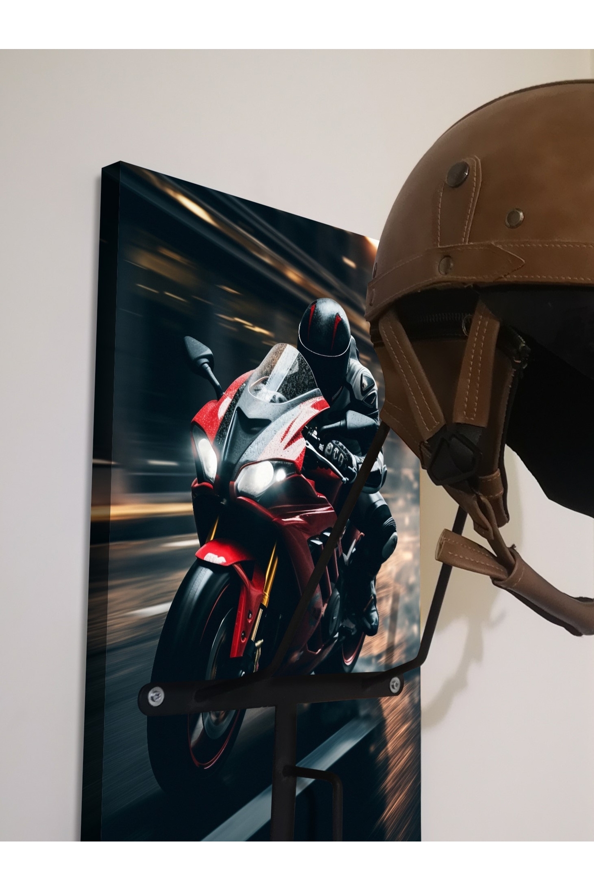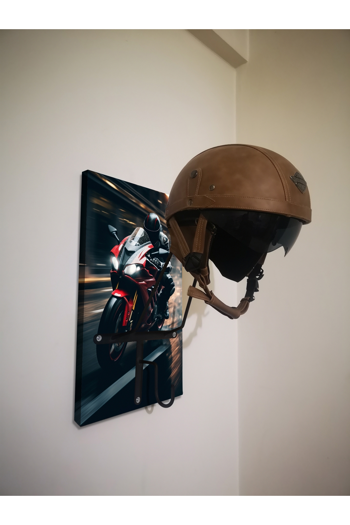 SPECIAL HELMET HANGER, COAT RACK, EQUIPMENT RACK FOR MOTORCYCLERS Product Features SPECIAL DESIGN THAT DOES NOT CONTACT THE PAD - Metal part angles and lengths are specially designed and do not come into contact with the protective pad inside the helmet. When you place your helmet correctly, it rests on the visor upper gap and the upper part of the neck, allowing your helmet to lie flat as if it were on your head, without touching the pad. - The metal design of the helmet hangers is independent of the size of your helmet and is suitable for all sizes. - It is manufactured using 6mm Transmission iron. It does not bend or bend and is extremely durable. - Baked Electrostatic Black Matte Texture Painted. In this way, the metal parts do not scratch or rust and maintain their form for years. - Panels used in wooden models are made of BB - BC quality natural wood solid panels (models with smooth edges are X2-MP, Pine or Spruce) or specially cut from imported Russian pine and made of solid, one-piece natural wood panels (models with natural looking edges are X2-Natura). is manufactured. - Printed and illustrated models are Glossy 1st Class Canvas prints. The canvas print is placed on a wooden panel and stapled at the back. HELMET RACK, COAT RANGER and KEYRING RANGER - 2 cobra hooks are delivered with the product to hang your keys. You can mount these hooks at any point you want on the panel. - There is a hook on each metal part of the helmet hanger bars to hang your coat on the clothes hanger. Metal parts are delivered disassembled to prevent damage to the panel during shipping. You can mount it practically with 3 screws. Screws and washers are packaged within the product. EASY INSTALLATION Easy installation with two hangers on the back. All you have to do is place a dowel and two screws on the wall. You hang the product like a painting. Since the wall type is unknown, the screws and dowels to mount it on the wall are not included in the package. Product Dimensions SINGLE HANGERS - 30X50cm back panel size. DOUBLE HANGERS - 30x70cm back wood panel size. ECO MODEL - 10x50cm back wood panel size. PERSONALIZATION - If personalization is desired on the panel, NAME-SURNAME, LOGO or NICKNAME can be engraved with CNC Laser, free of charge, in the lower left corner. - If orders come from sales channels, Genuine Leather is personalized and added to the package. You can easily stick it to any corner of the panel you want. - Do not forget to send your photos in the appropriate resolution and format for our hangers prepared as canvas prints. IN CASE OF SHIPPING AND DAMAGE - Although it is a very, very rare situation that we encounter the product being damaged in shipping, we kindly ask you to please contact us. We always deliver a new one to replace the damaged part. - It is very important for you to spare time for your damaged cargo and keep a cargo damage report so that our efforts do not go to waste. Even if there is no report, we will definitely resolve your grievance. GGART DECORATION - GGART HANDMADE