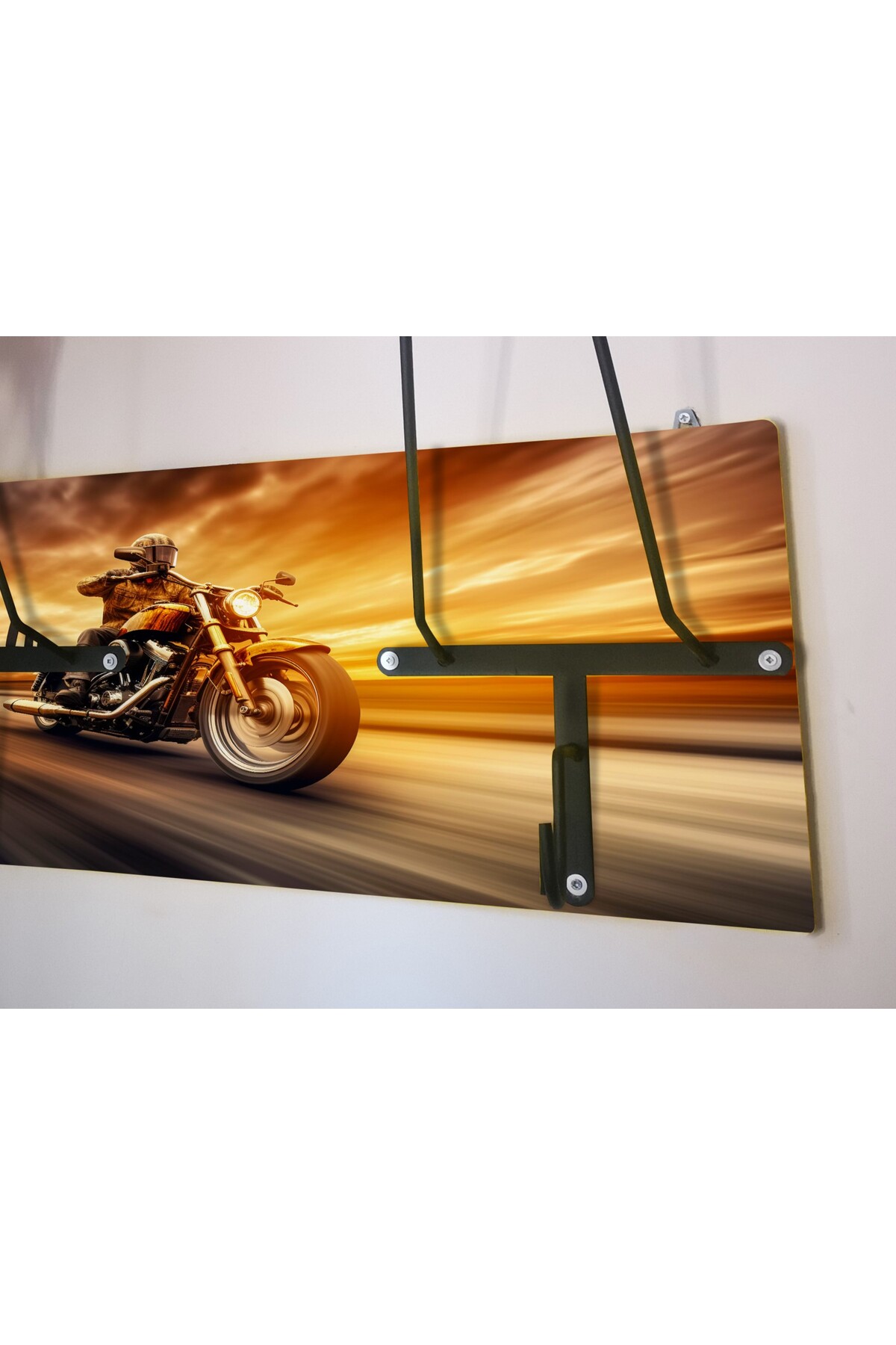 SPECIAL HELMET HANGER, COAT RACK, EQUIPMENT RACK FOR MOTORCYCLERS Product Features SPECIAL DESIGN THAT DOES NOT CONTACT THE PAD - Metal part angles and lengths are specially designed and do not come into contact with the protective pad inside the helmet. When you place your helmet correctly, it rests on the visor upper gap and the upper part of the neck, allowing your helmet to lie flat as if it were on your head, without touching the pad. - The metal design of the helmet hangers is independent of the size of your helmet and is suitable for all sizes. - It is manufactured using 6mm Transmission iron. It does not bend or bend and is extremely durable. - Baked Electrostatic Black Matte Texture Painted. In this way, the metal parts do not scratch or rust and maintain their form for years. - Panels used in wooden models are made of BB - BC quality natural wood solid panels (models with smooth edges are X2-MP, Pine or Spruce) or specially cut from imported Russian pine and made of solid, one-piece natural wood panels (models with natural looking edges are X2-Natura). is manufactured. - Printed and illustrated models are Glossy 1st Class Canvas prints. The canvas print is placed on a wooden panel and stapled at the back. HELMET RACK, COAT RANGER and KEYRING RANGER - 2 cobra hooks are delivered with the product to hang your keys. You can mount these hooks at any point you want on the panel. - There is a hook on each metal part of the helmet hanger bars to hang your coat on the clothes hanger. Metal parts are delivered disassembled to prevent damage to the panel during shipping. You can mount it practically with 3 screws. Screws and washers are packaged within the product. EASY INSTALLATION Easy installation with two hangers on the back. All you have to do is place a dowel and two screws on the wall. You hang the product like a painting. Since the wall type is unknown, the screws and dowels to mount it on the wall are not included in the package. Product Dimensions SINGLE HANGERS - 30X50cm back panel size. DOUBLE HANGERS - 30x70cm back wood panel size. ECO MODEL - 10x50cm back wood panel size. PERSONALIZATION - If personalization is desired on the panel, NAME-SURNAME, LOGO or NICKNAME can be engraved with CNC Laser, free of charge, in the lower left corner. - If orders come from sales channels, Genuine Leather is personalized and added to the package. You can easily stick it to any corner of the panel you want. - Do not forget to send your photos in the appropriate resolution and format for our hangers prepared as canvas prints. IN CASE OF SHIPPING AND DAMAGE - Although it is a very, very rare situation that we encounter the product being damaged in shipping, we kindly ask you to please contact us. We always deliver a new one to replace the damaged part. - It is very important for you to spare time for your damaged cargo and keep a cargo damage report so that our efforts do not go to waste. Even if there is no report, we will definitely resolve your grievance. GGART DECORATION - GGART HANDMADE